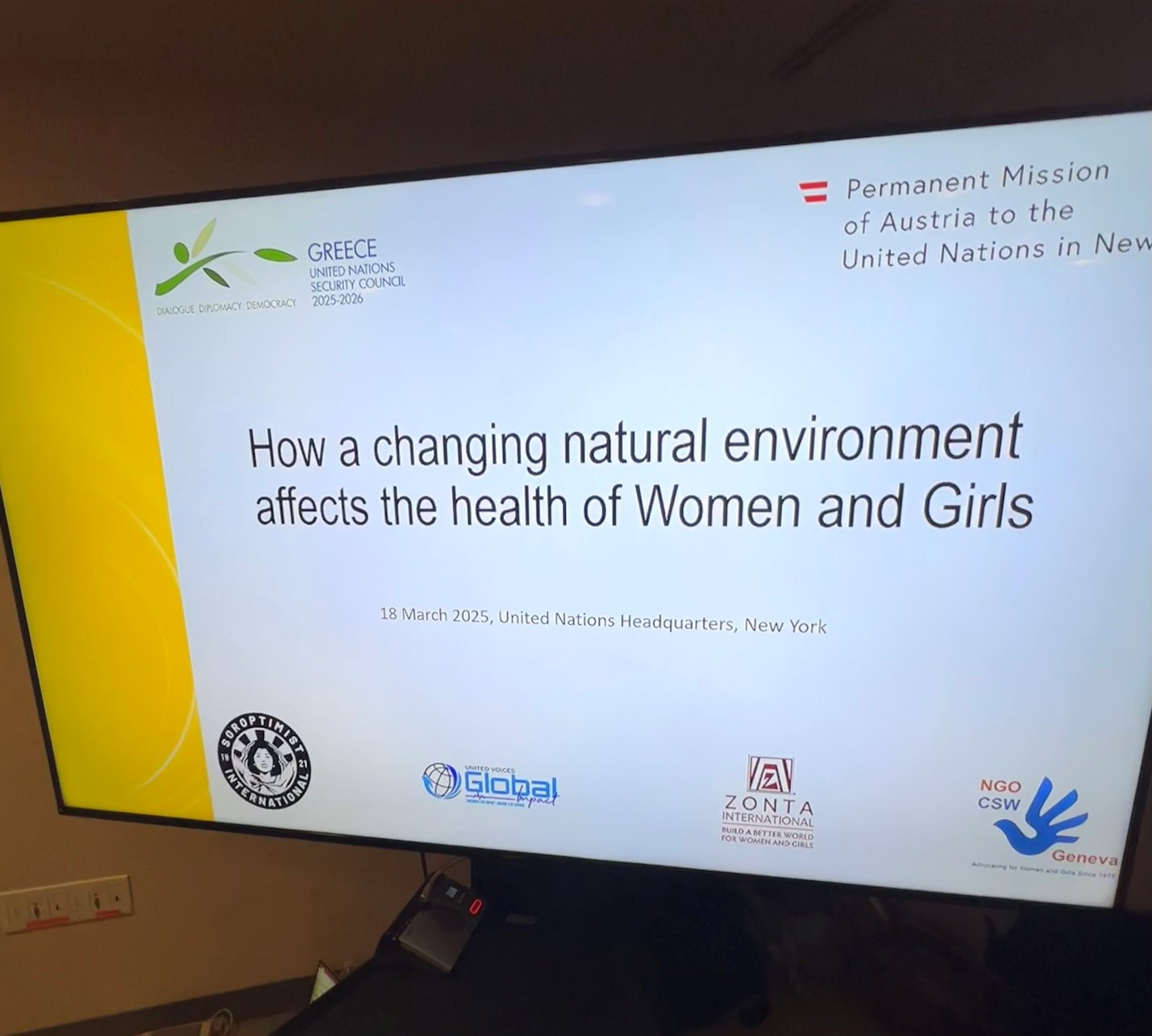 - The session opened with Soroptimist International representative to UN Geneva emphasizing the universal right to a healthy environment, as outlined in UN Resolution A/RES/76/300. The Permanent Mission of Austria reaffirmed the global commitment to clean air and a sustainable climate. The Permanent Mission of Greece to UN introduced a video presentation by a WHO expert on the link between climate change and women’s health. ZONTA International highlighted the right of healthy environment for indigenous and minorities. UVGI presented data on the number of women and girls affected by environmental degradation and its economic impact on health systems. A UN Special Rapporteur on Toxics and Human Rights provided insights into The effect of Toxics on the Health of Women and Girls. A UN Youth Delegate examined the rise in infections and inflammatory diseases among women due to environmental changes. The session concluded with a UNEP Assistant Secretary-General on what Member States and advocacy organizations can do calling for stronger international collaboration and policy frameworks to address these pressing challenges.